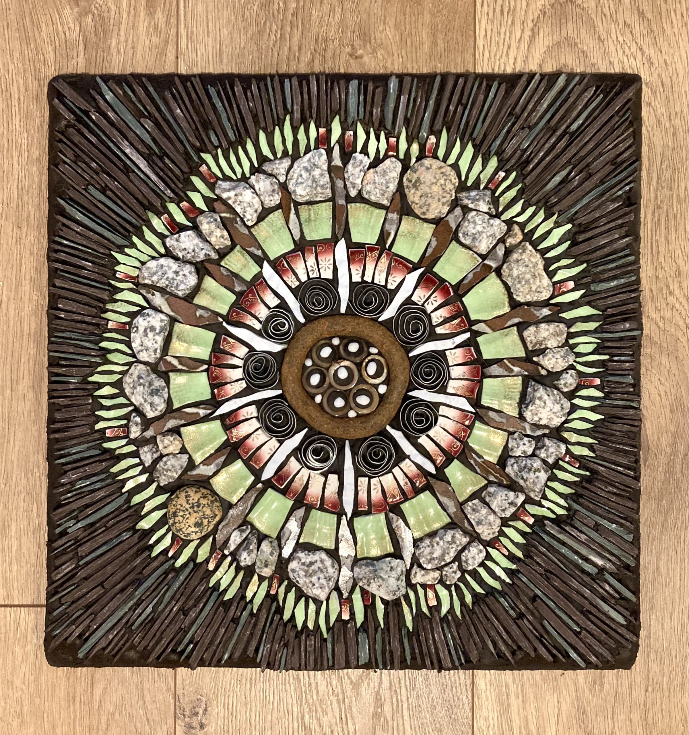 Mosaic work has become the perfect medium to marry my love of nature, an insatiable thirst to scavenge for reusable oddities and the chance to spark curiosity, appreciation and beauty through the use of unlikely materials. In addition to working with traditional tesserae like Italian and Mexican smalti, stained glass, stone and tile, I incorporate rocks, fossils, knots of wood, creek glass and rusty bits found on trails. When I’m working on new pieces, my brain is completely open and engaged in the process of breaking, shaping, placing and cementing. We all have different ways to cope with stress, hardship and loss, as well as profound gratitude. Creating and engaging in art has always been vital in doing that for me.