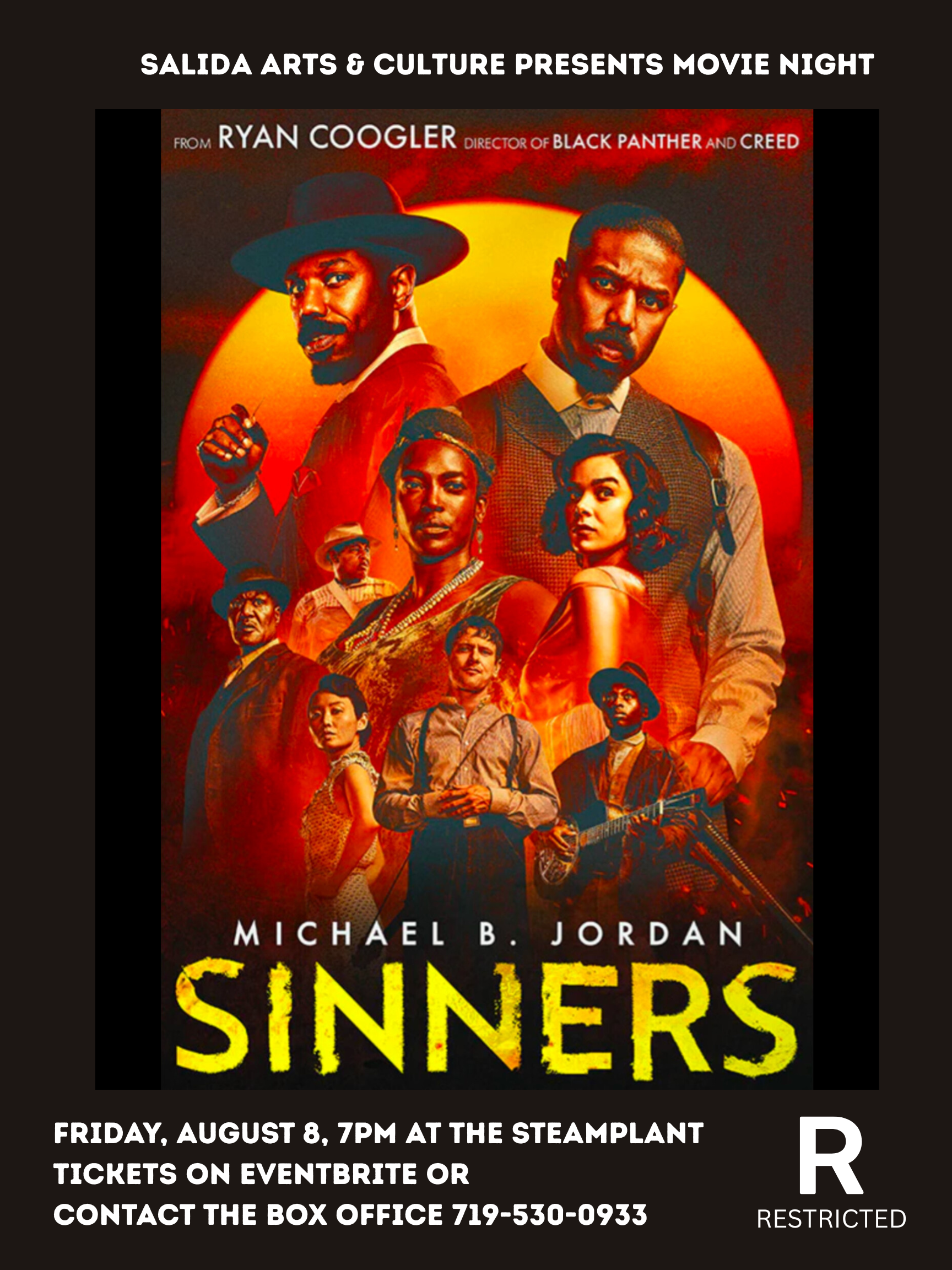 Step into the STEAMPLANT SPEAKEASY & join Salida Arts & Culture Halloween weekend Thursday, October 30 for 1930’s themed cocktails, live music, concessions and a SINNERS THEMED/ VAMPIRE COSTUME Dress Up and Photo booth. There will be prizes! Then enjoy Ryan Coogler’s genre‑bending vampire epic! Michael B. Jordan stars as twin brothers opening a juke joint — only to unleash a supernatural threat. Expect soul‑stirring blues, potent social themes, and edge‑of‑your‑seat horror. Discover why critics call it “one of the best films of 2025!”