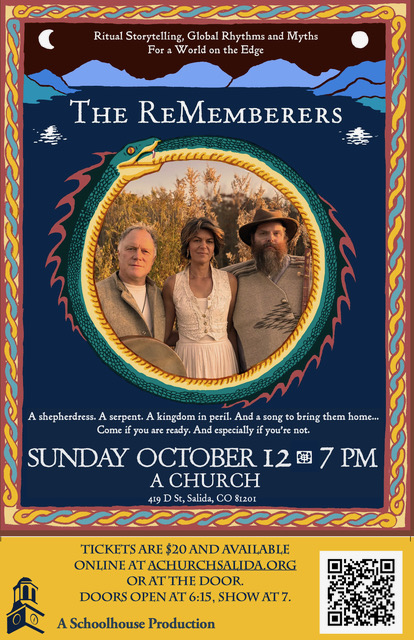 The ReMemberers ​ Sunday, October 12, 2025 ​ 6:15pm-9:30pm ​ A Church 419 D Street Salida CO ​ Doors 6:15 P.M. Music 7:00 P.M. Tix $20.00 A Schoolhouse Production The ReMemberers is a genre-blurring trio that merges ancient folklore, global singing traditions, and instrumental virtuosity into a vivid, transportive concert experience. Their latest performance, The […]