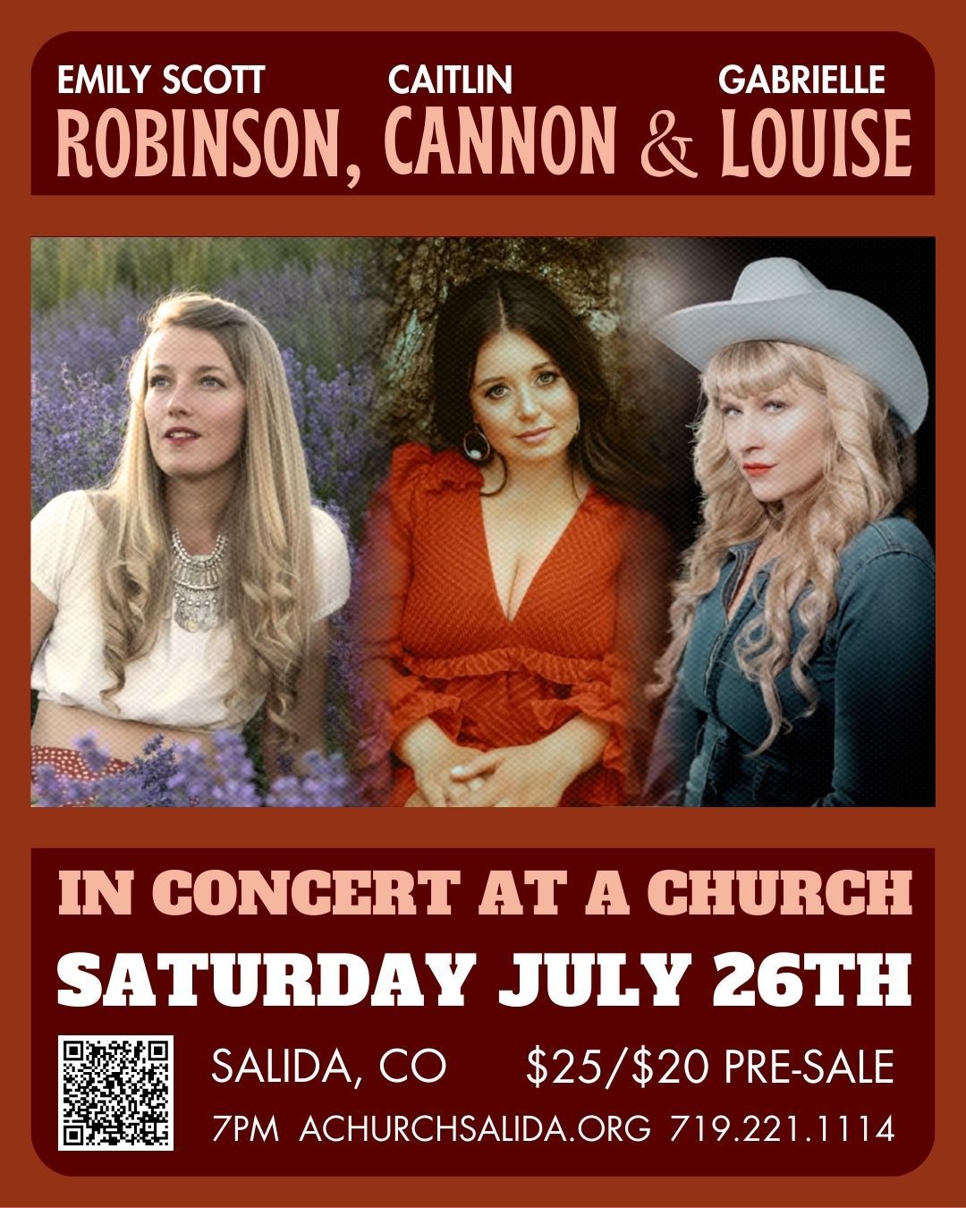 A collaborative triple bill featuring Western Slope sirens Gabrielle Louise, Caitlin Cannon, and Emily Scott Robinson. Expect crafty songwriting, spellbinding storytelling, and some seriously witchy harmonies.