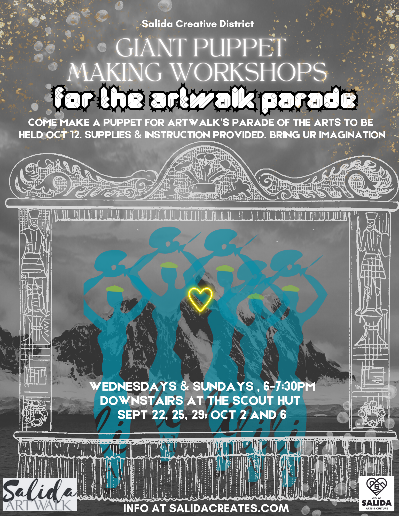 🎨Free puppet-making workshops for arts or community groups. Come and create giant, colorful and dramatic puppets, headpieces, masks, or props for the 1st Salida Art Walk Parade of the Arts on ArtWalk Saturday, October 12. Then join us in Riverside Park for the Art pARTy with performances, DJ & dancing. 🎶